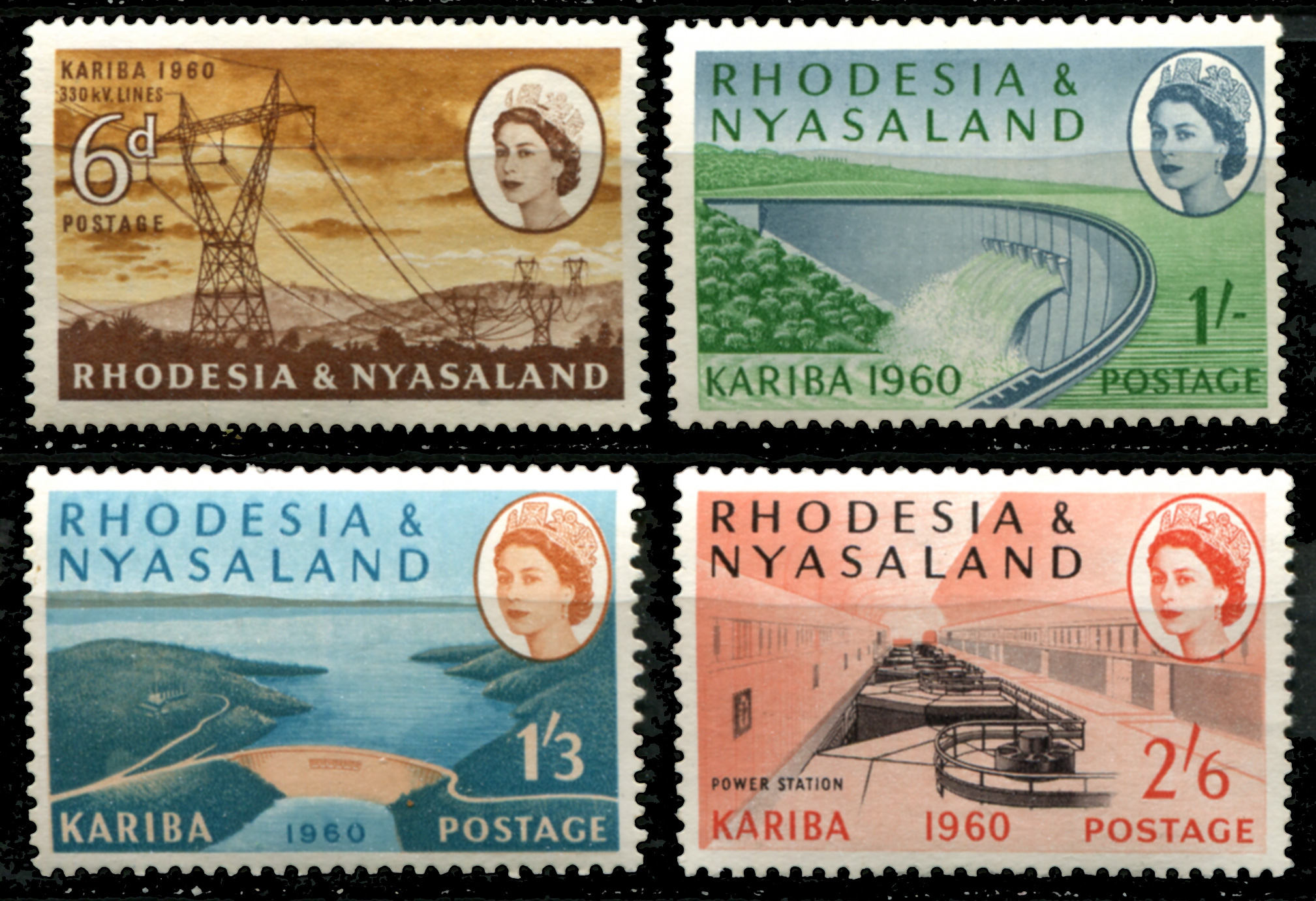Родезия и Ньясаленд 1960 г. • Gb# 33-36 • 6 d. - 2s.6d. • Открытие каскада гидроэлектростанций Кариба ( 4 марки ) • MNH OG XF ( кат.- £ 11 )