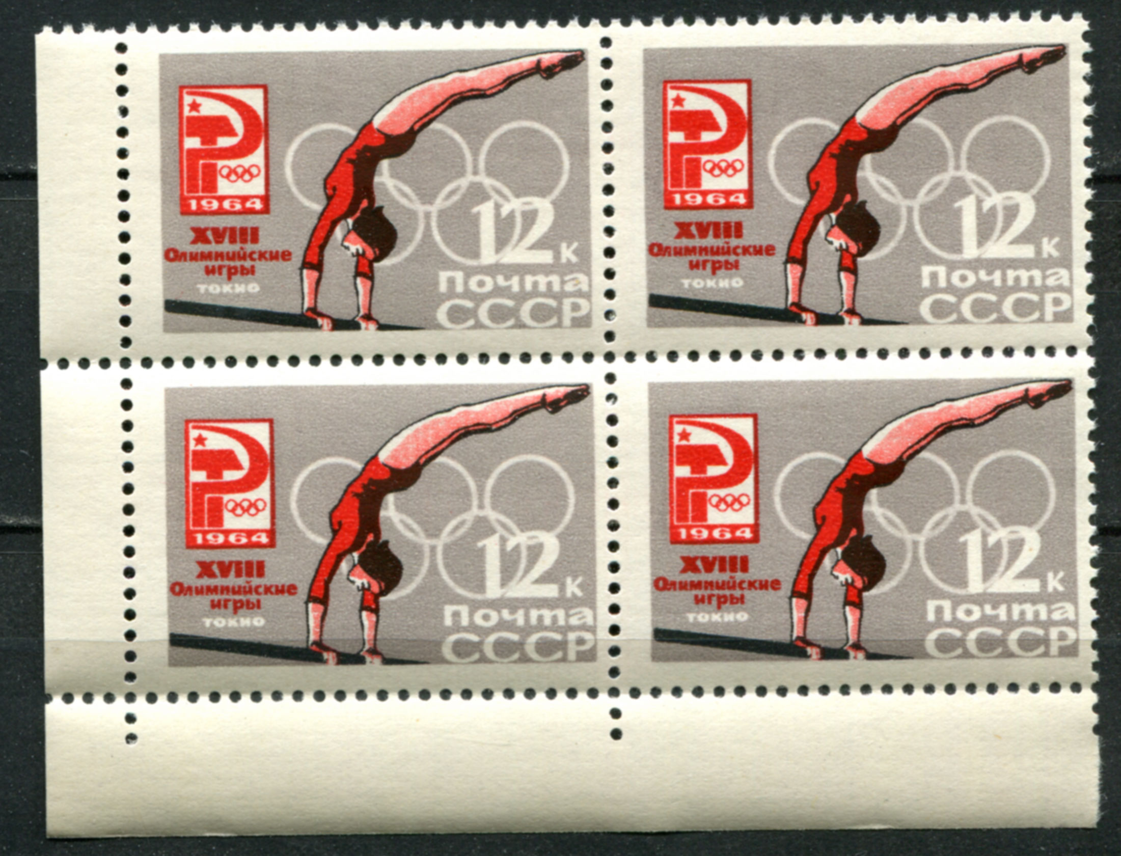 СССР 1964 г. • Сол# 3083 • 12 коп. • Летние Олимпийские игры, Токио • гимнастика(брусья) • кв.блок • MNH OG XF ( кат. - ₽ 80 )