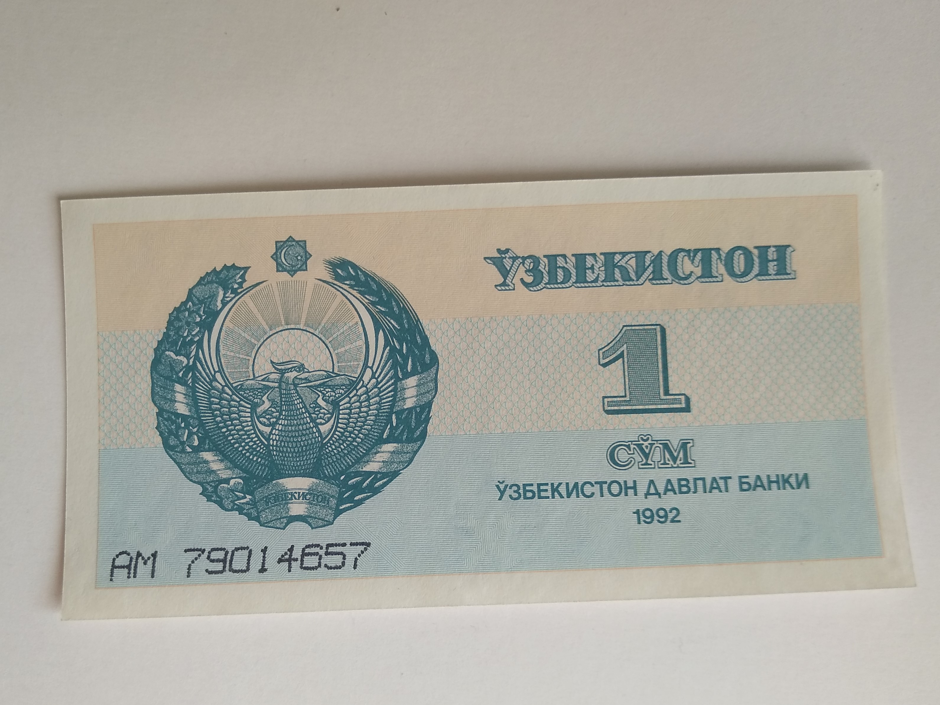 Узбекистан 1992 г. • 1 сум • регулярный выпуск • серия № - АМ 79014657 • UNC пресс