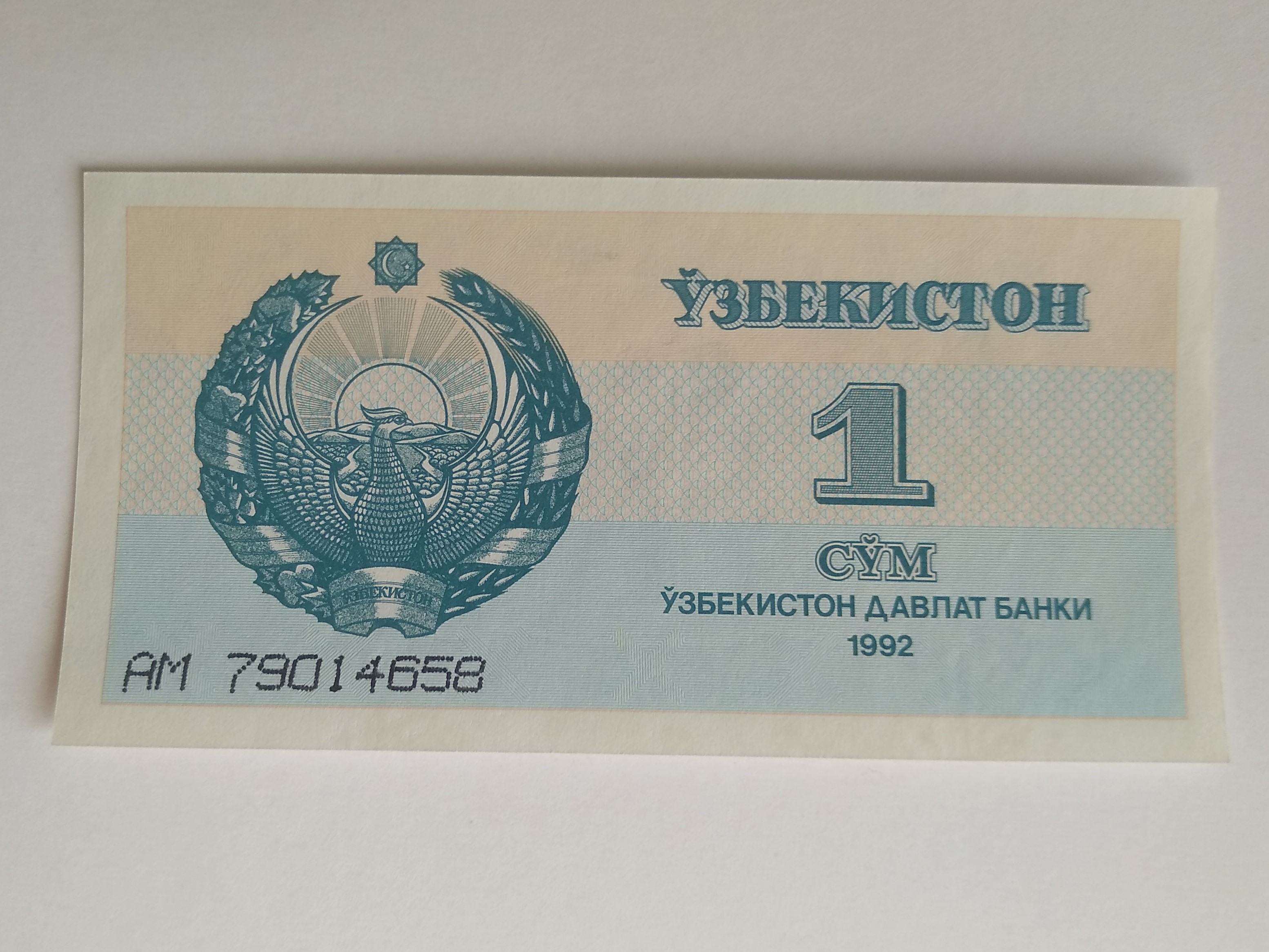 Узбекистан 1992 г. • 1 сум • регулярный выпуск • серия № - АМ 79014658 • UNC пресс