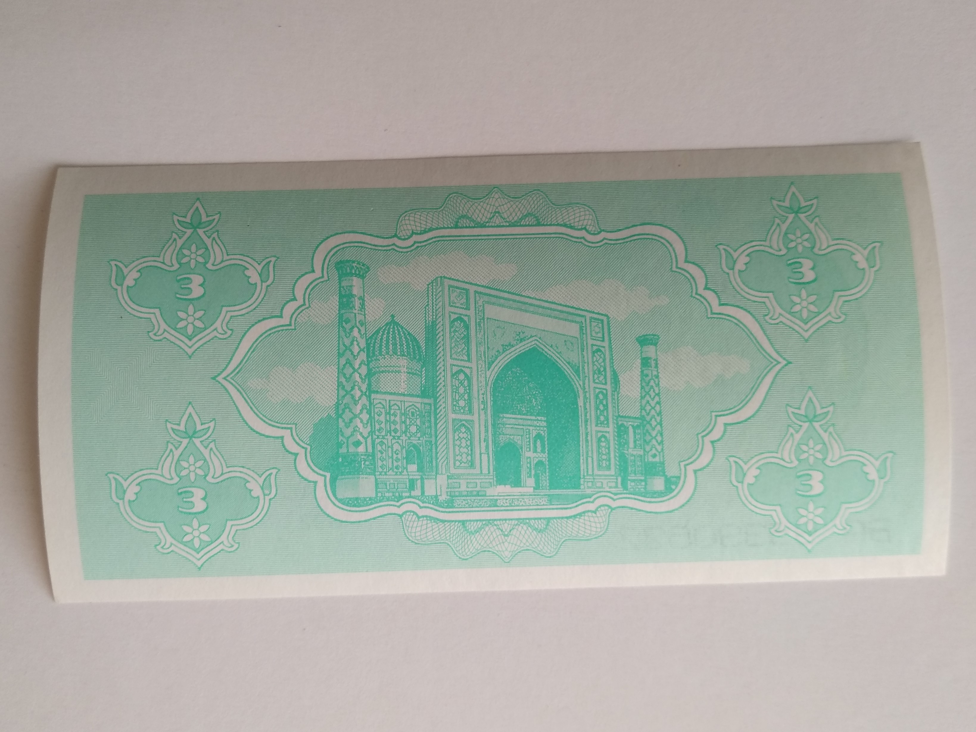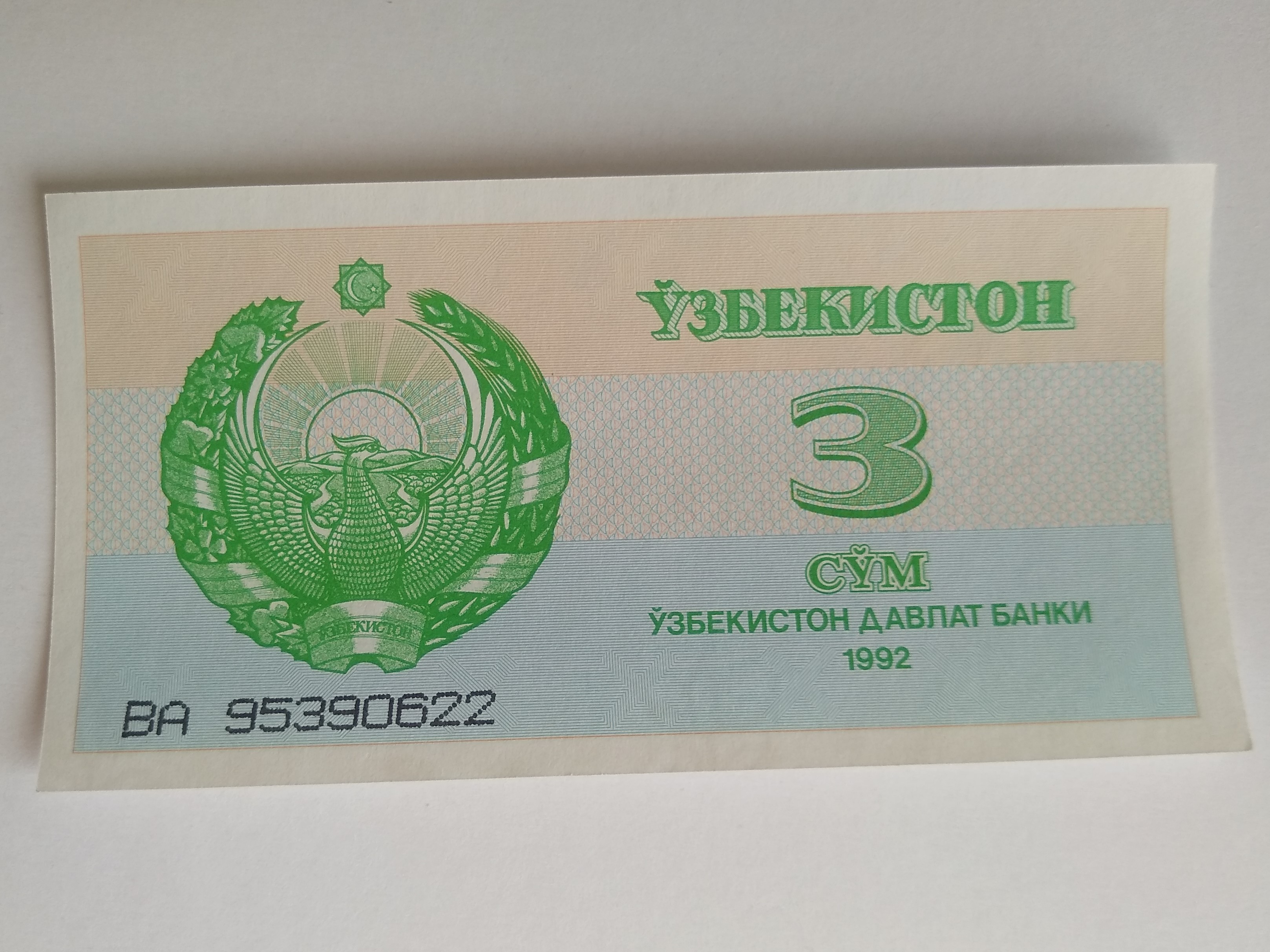 Узбекистан 1992 г. • 3 сум • регулярный выпуск • серия № - ва95390622 • UNC пресс