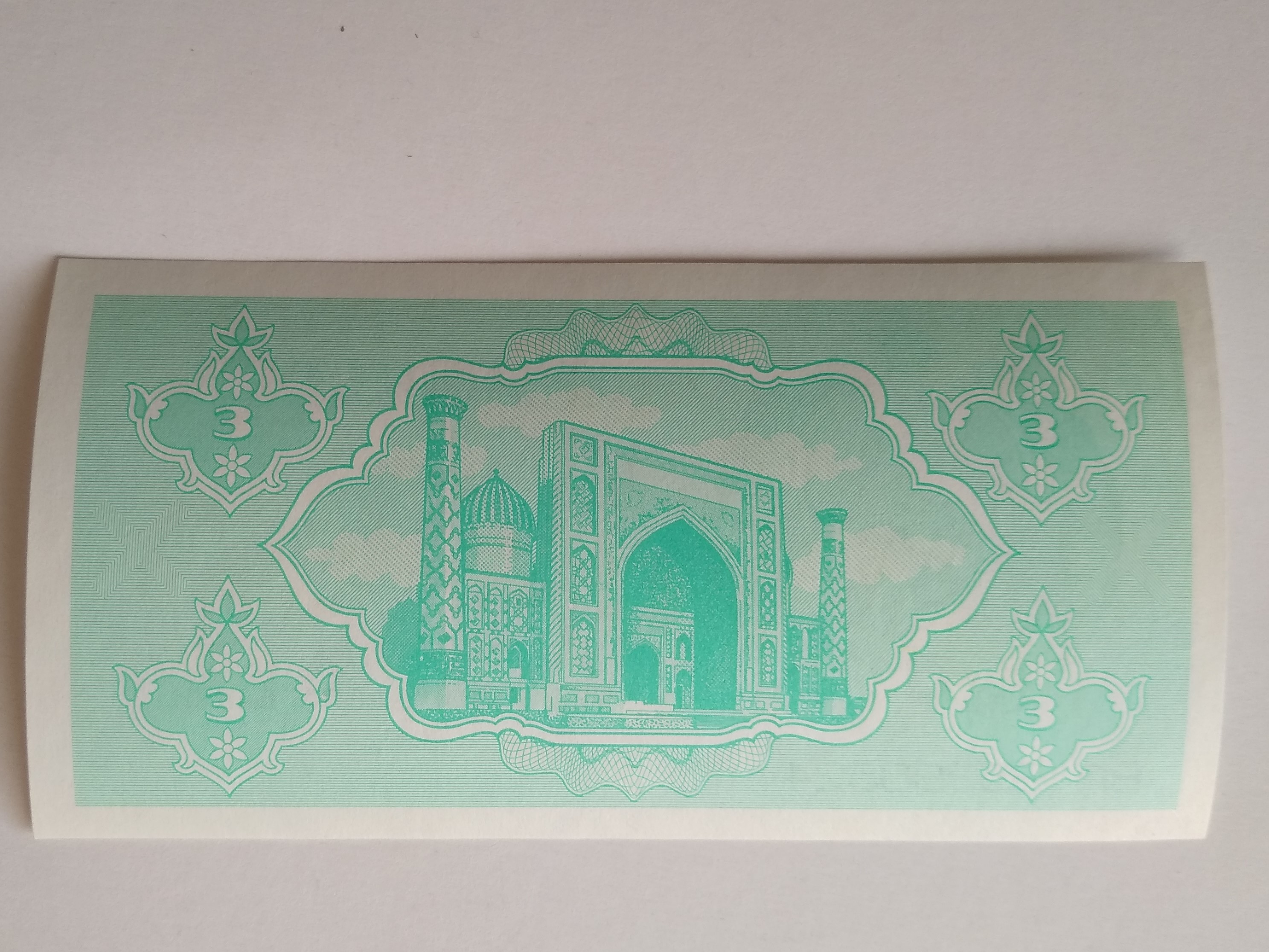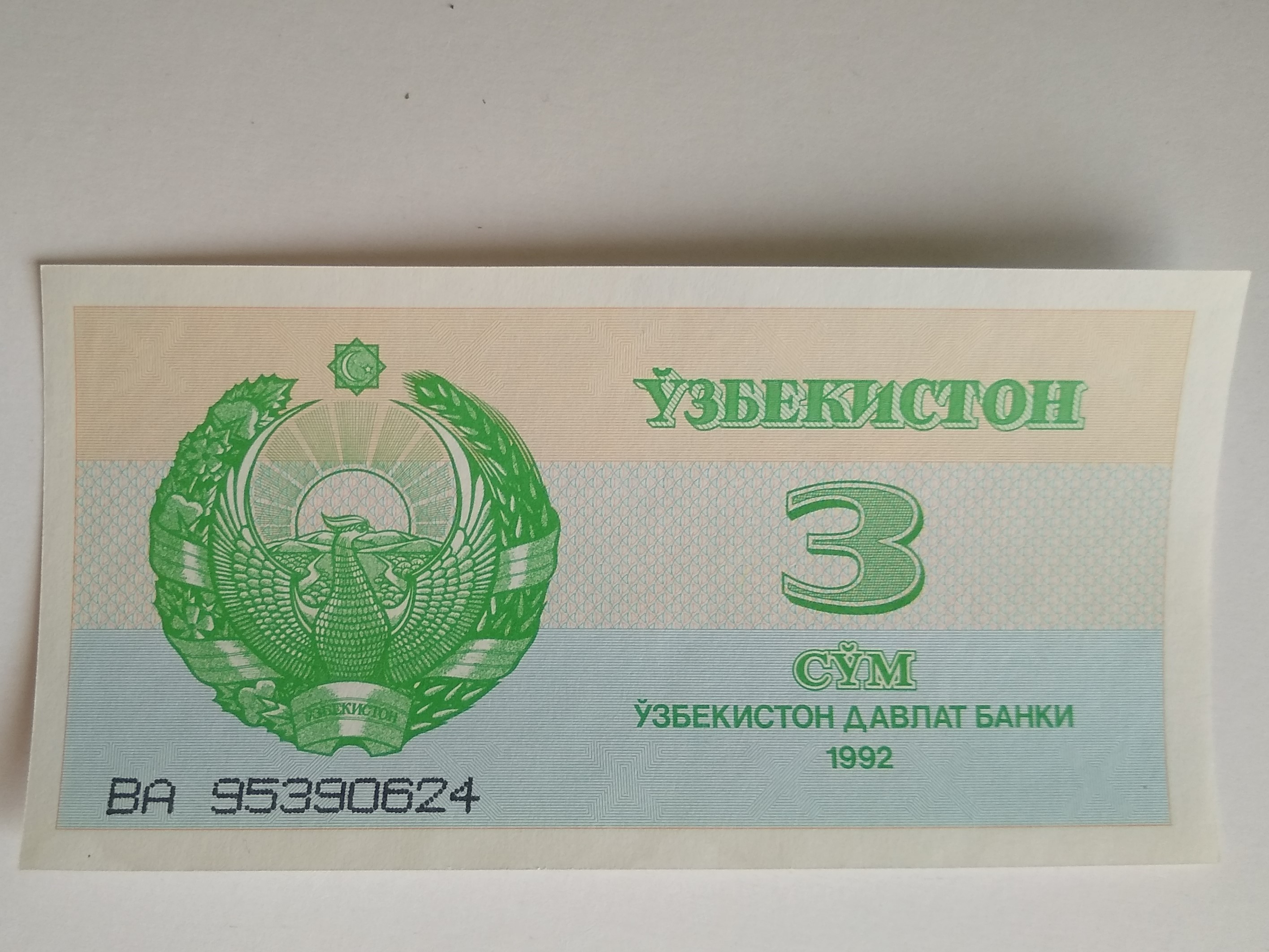 Узбекистан 1992 г. • 3 сум • регулярный выпуск • серия № - ва95390624 • UNC пресс